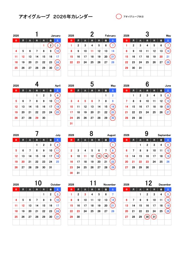 アオイグループの2026年営業日をご案内させて頂きます。 2026年においてもアオイグループを何卒よろしくお願い申し上げます。